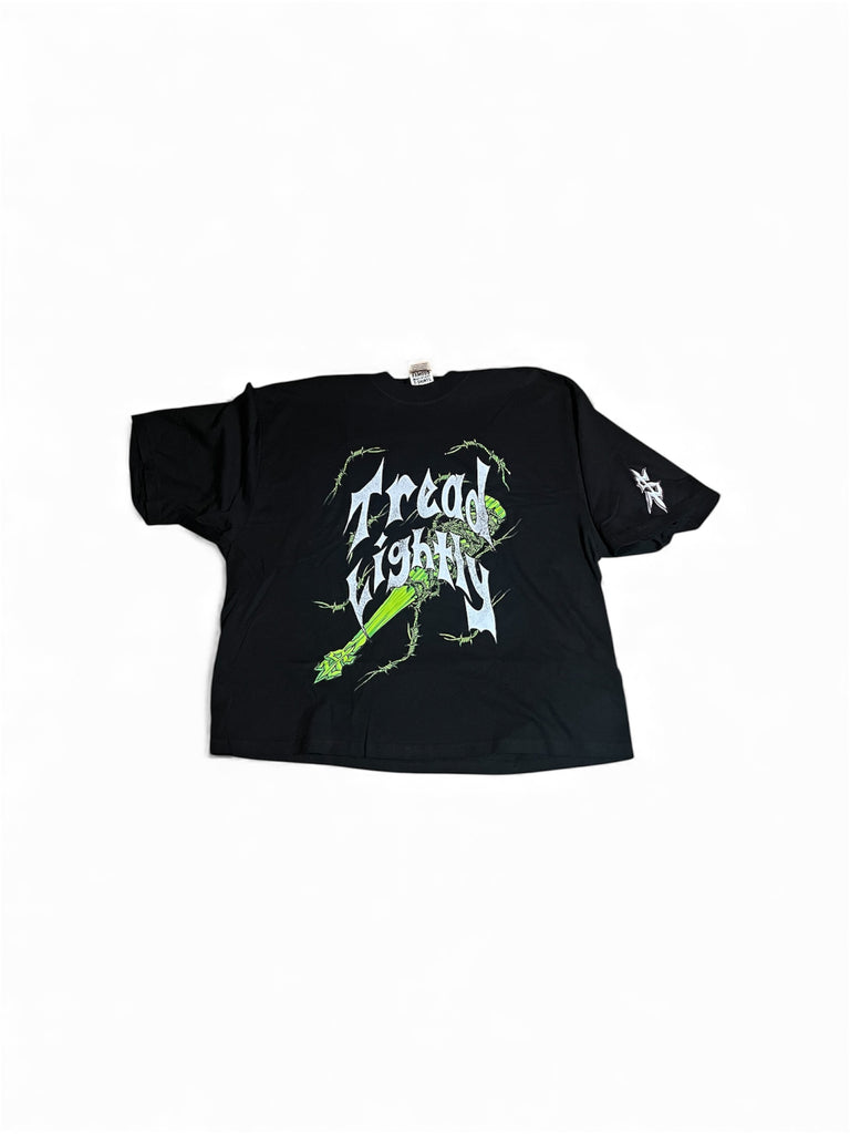 Front: Barbed-wire bat graphic with "Tread Lightly" quoted in foreground. This design adds urban streetwear vibes that speaks 'proceed with caution' energy to your everyday wardrobe.